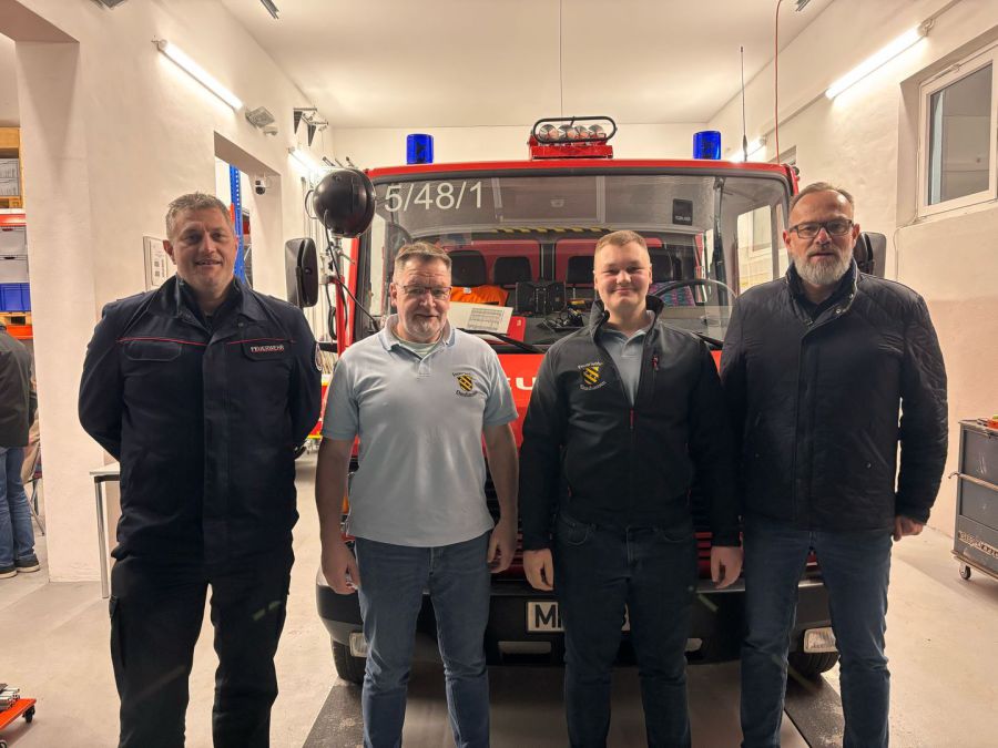 v.l. stellv. GBI Heiko Gerlach, Wehrführer Marco Werner, stellv. Wehrführer Fyn-Luis Werner, Bürgermeister Marco Schmidtke