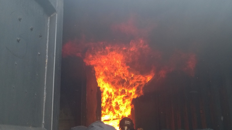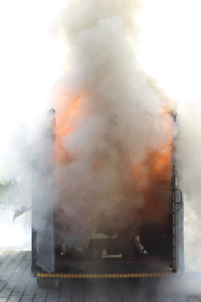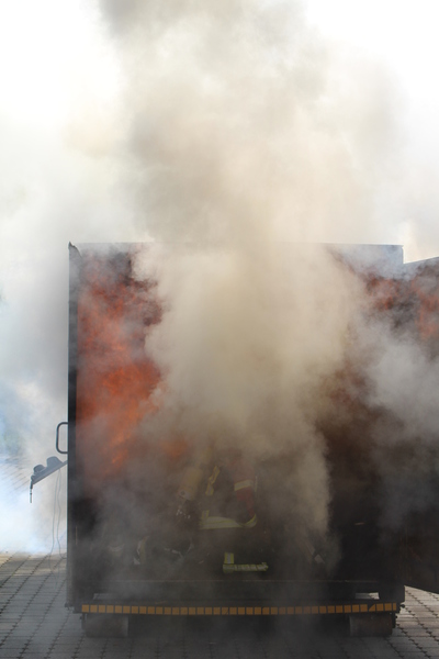 Die Druckwelle des Flashovers reißt die Containertüren auf und als Außenstehender bekommt man eine vage Vorstellung davon, wie sich die Feuerwehrleute im Inneren fühlen müssen. (Foto: Valentin)