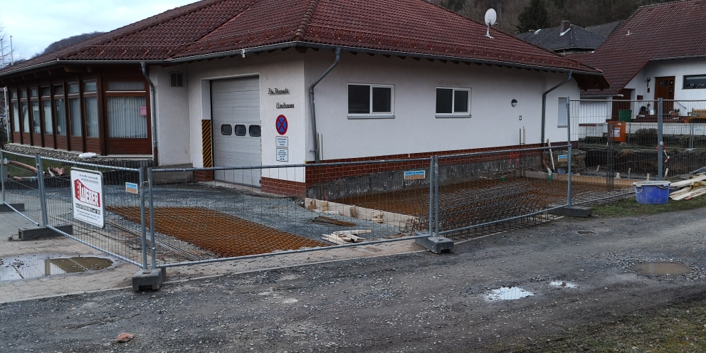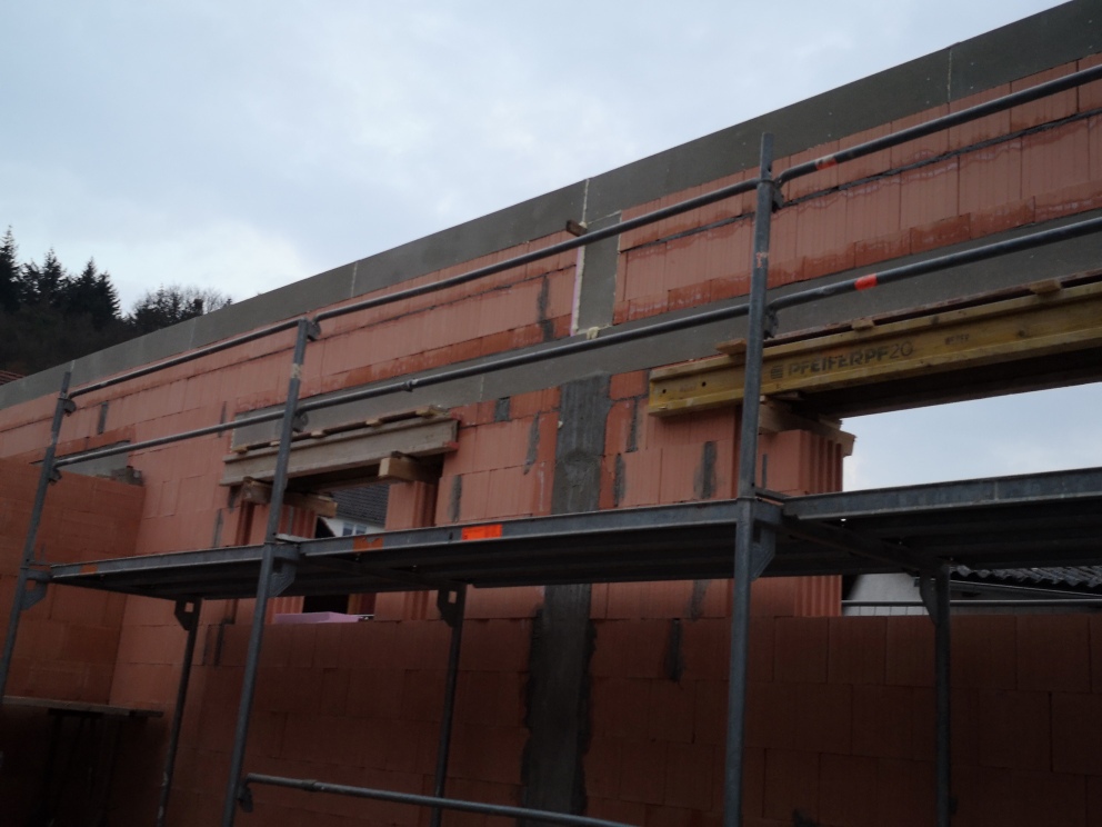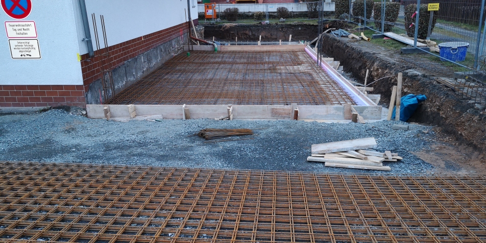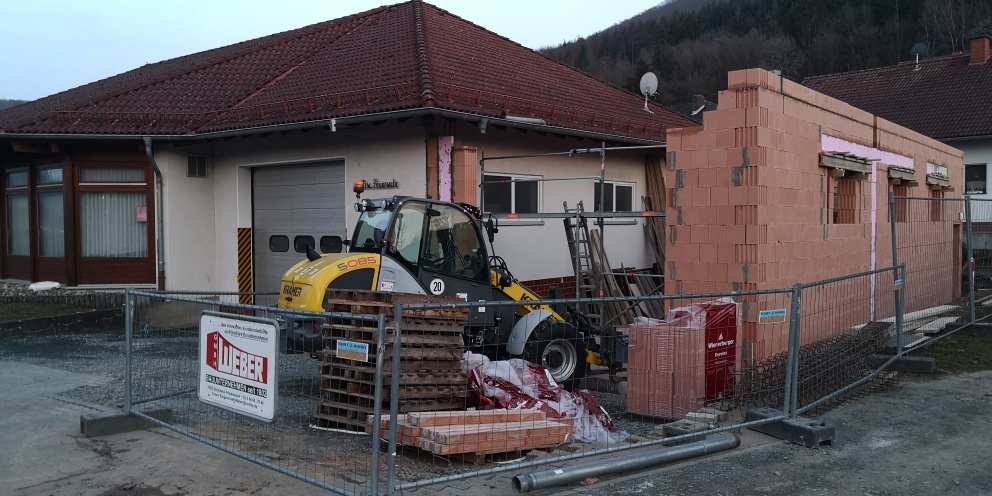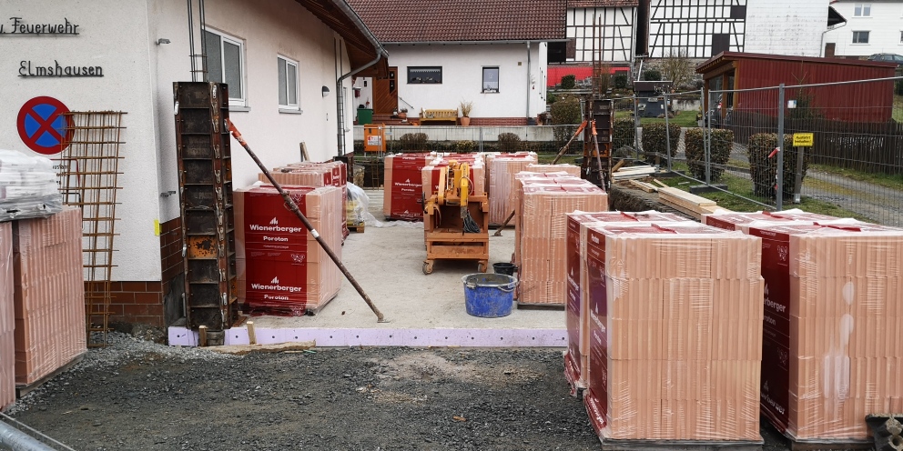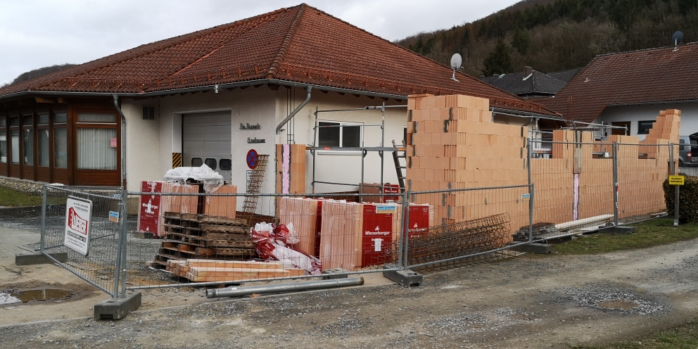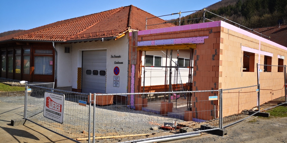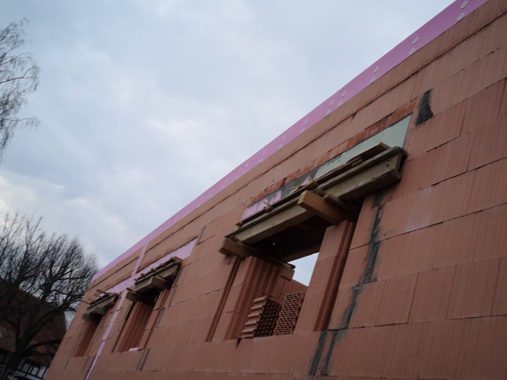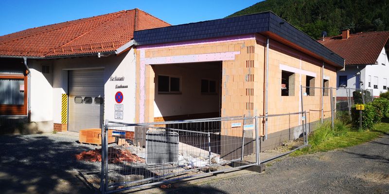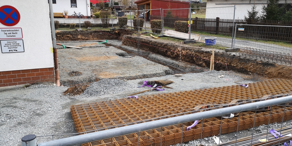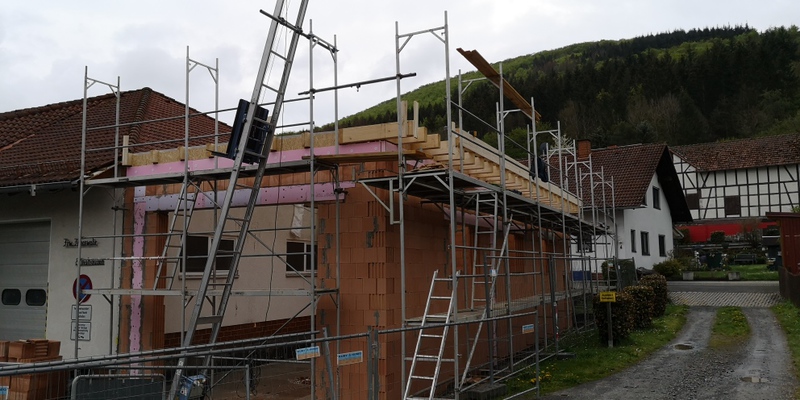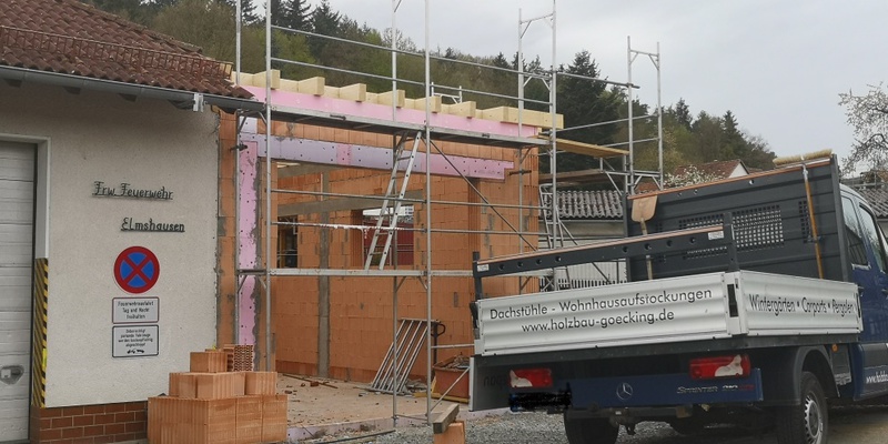In der KW 14 und 15 bremste das Wetter die Baumaßnahme ein wenig ein. Trotz allem wurde einiges erledigt. So wurde der Ringanker beim Rohbau gegossen, im alt Bestand (Schulungsraum, Sanitären Anlagen, Umkleide Damen und Flur) wurden die Holzdecken entfernt. Die Deckenverkleidungen mussten auf Grund des Umfangreichen Brandschutzkonzeptes entfernt werden und werden durch brandhemmende Deckenverkleidungen später ersetzt. In der KW 16 und 17 wurden die weiteren Maßnahmen wieder durch das Wetter eingebremst. In der KW 18 wurde der Rohbau und der Dachanschluss vom Bestand für die Zimmerarbeiten vorbereitet. Die Zimmerleute werden ab der KW 19 die Dachkonstruktion aufschlagen und im Anschluss wird der Dachdecker das Dach eindecken.
