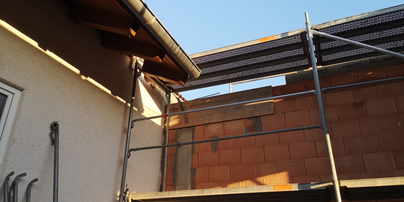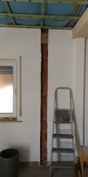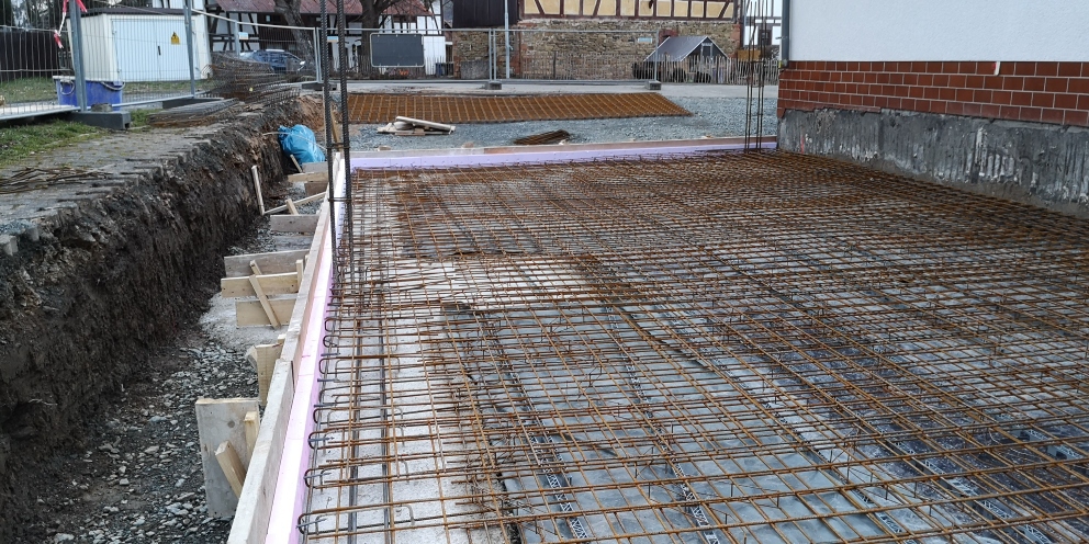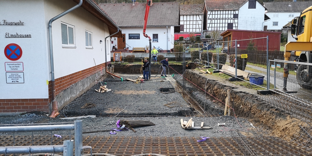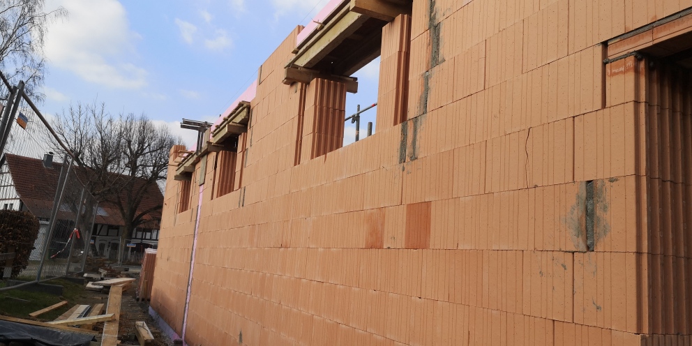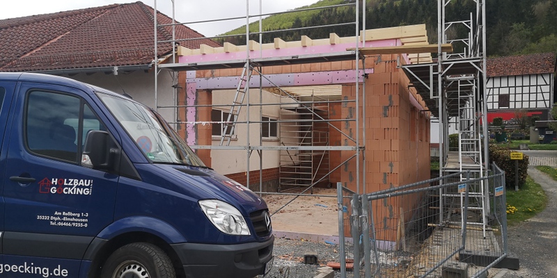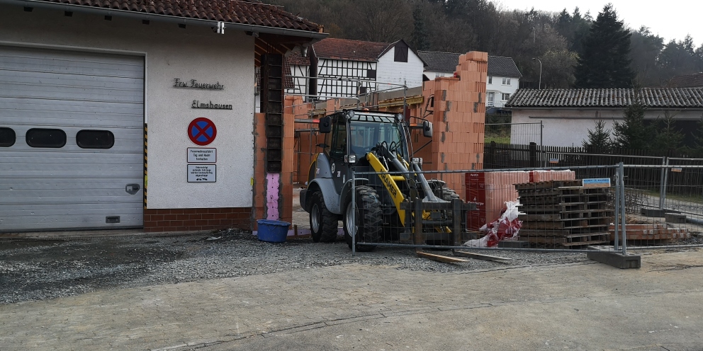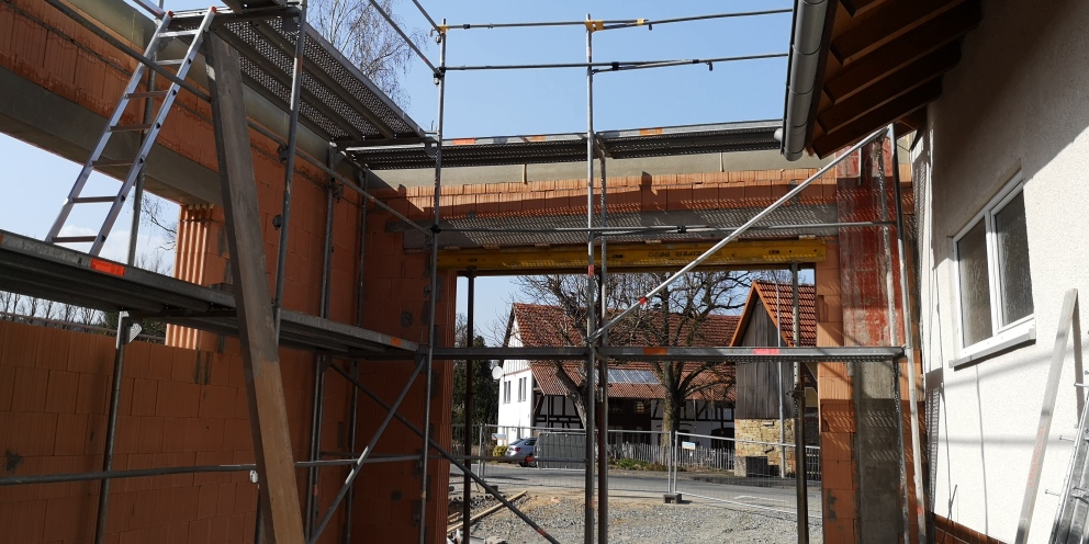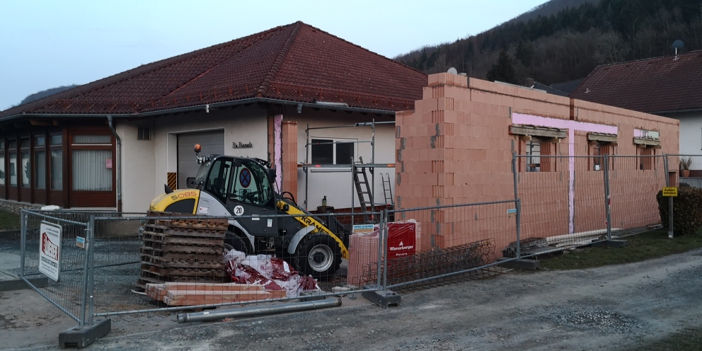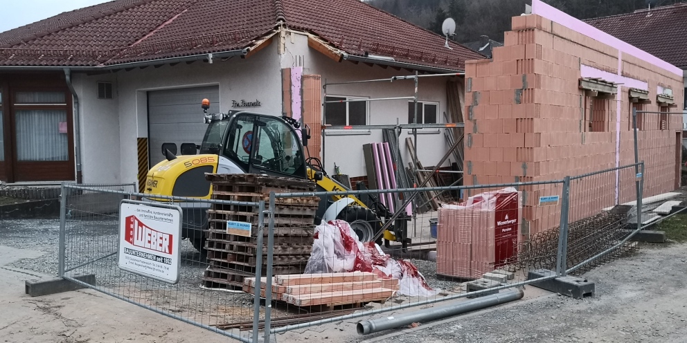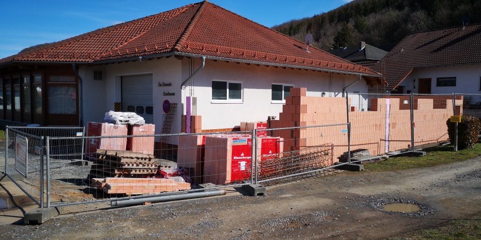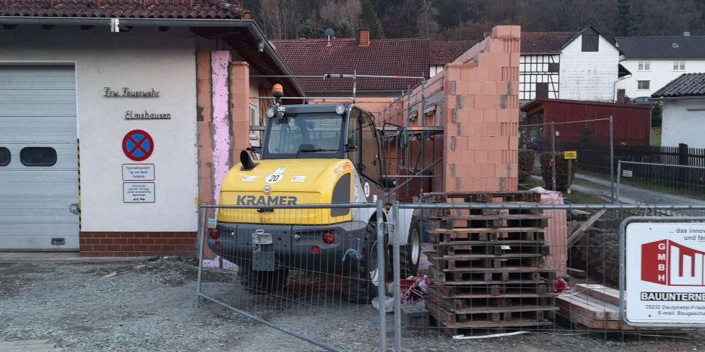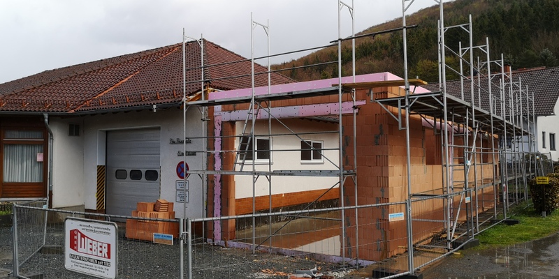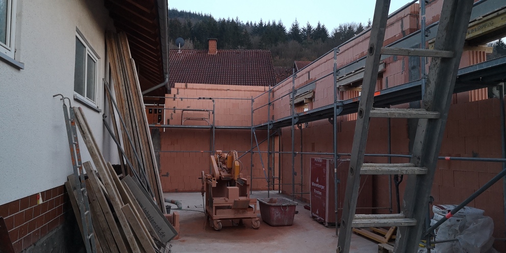 In der KW 14 und 15 bremste das Wetter die Baumaßnahme ein wenig ein. Trotz allem wurde einiges erledigt. So wurde der Ringanker beim Rohbau gegossen, im alt Bestand (Schulungsraum, Sanitären Anlagen, Umkleide Damen und Flur) wurden die Holzdecken entfernt. Die Deckenverkleidungen mussten auf Grund des Umfangreichen Brandschutzkonzeptes entfernt werden und werden durch brandhemmende Deckenverkleidungen später ersetzt. In der KW 16 und 17 wurden die weiteren Maßnahmen wieder durch das Wetter eingebremst. In der KW 18 wurde der Rohbau und der Dachanschluss vom Bestand für die Zimmerarbeiten vorbereitet. Die Zimmerleute werden ab der KW 19 die Dachkonstruktion aufschlagen und im Anschluss wird der Dachdecker das Dach eindecken.